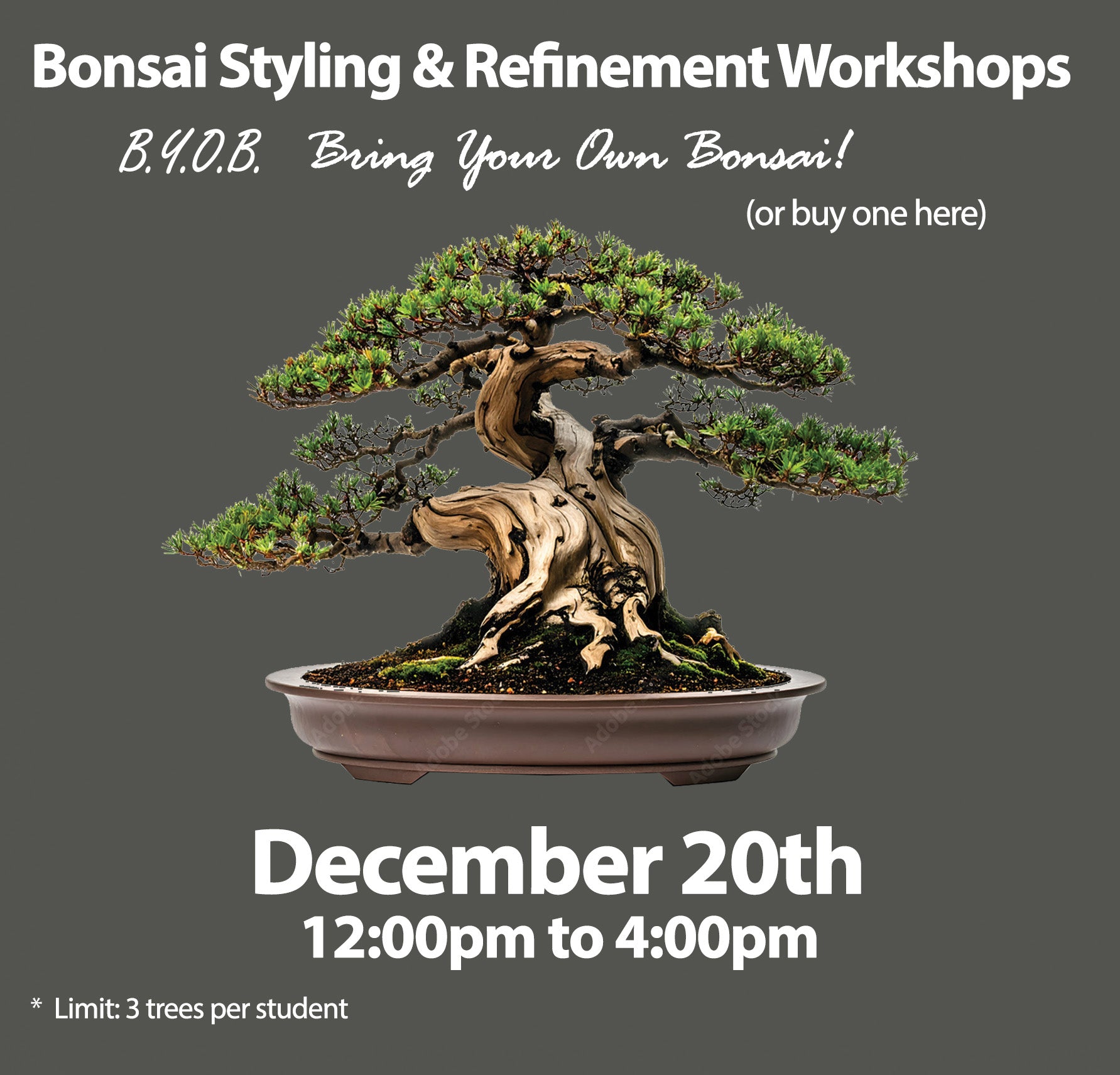 Bonsai wire, soil, pots, and other materials will be available for purchase at the store during the workshop for those needing additional supplies.