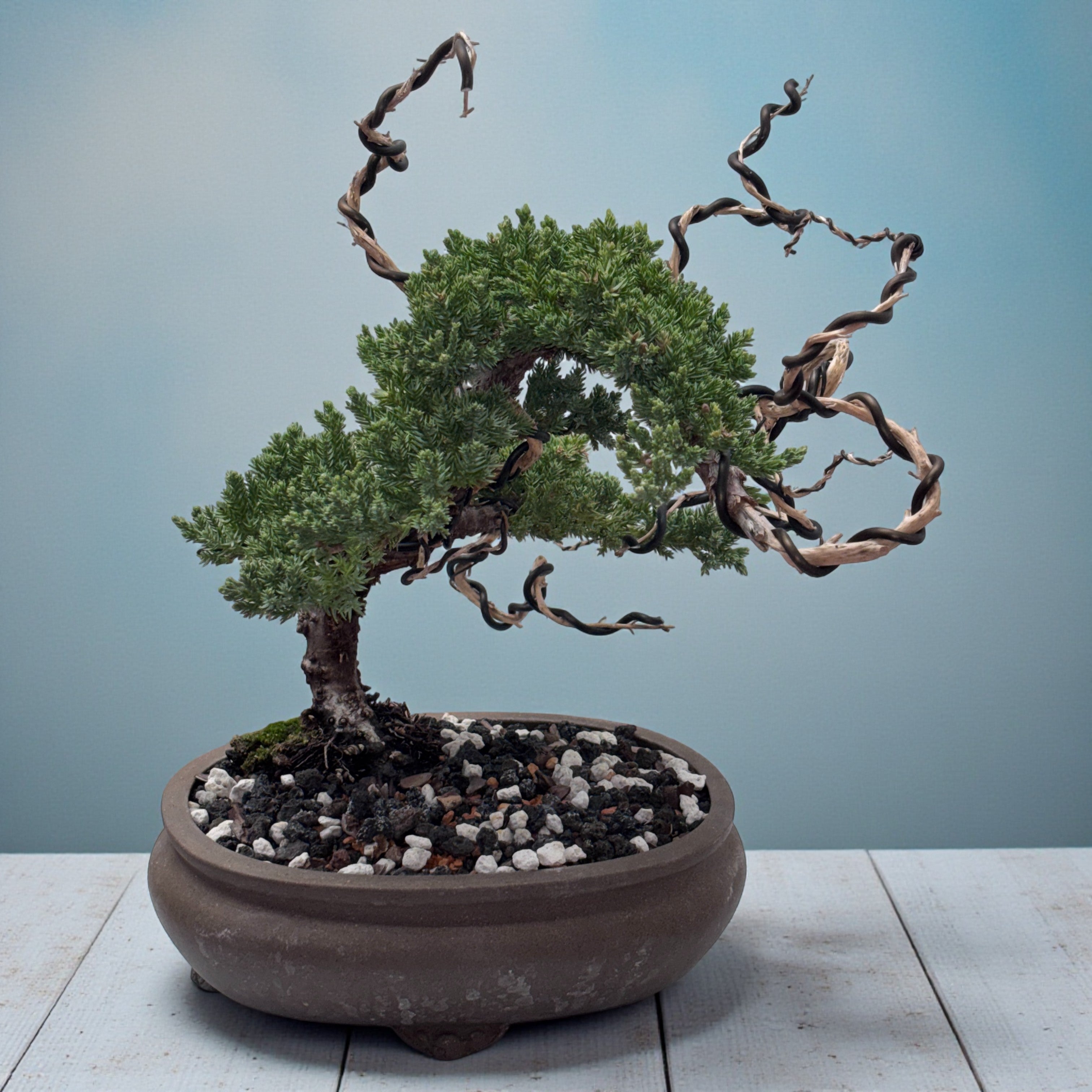 Juniper Deadwood Collection bonsai embodies the aesthetic of age and resilience through naturally weathered deadwood features. This pre-styled specimen arrives wired and ready for refinement—simply remove the training wire and apply Jin Seal to whiten and preserve the deadwood elements, enhancing their sculptural character. Ideal for collectors seeking authentic deadwood styling with minimal intervention required.