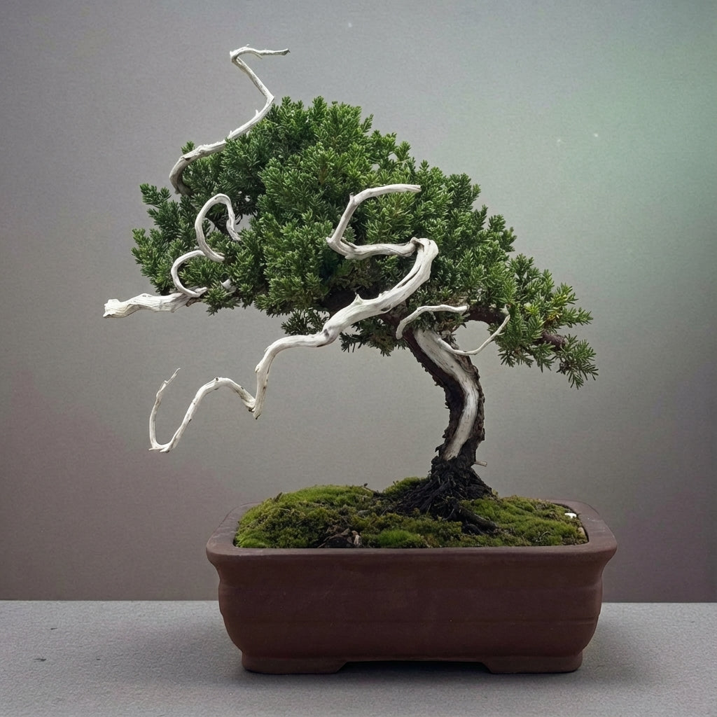 Juniper Deadwood Collection bonsai embodies the aesthetic of age and resilience through naturally weathered deadwood features. This pre-styled specimen arrives wired and ready for refinement—simply remove the training wire and apply Jin Seal to whiten and preserve the deadwood elements, enhancing their sculptural character. Ideal for collectors seeking authentic deadwood styling with minimal intervention required.